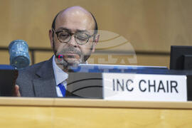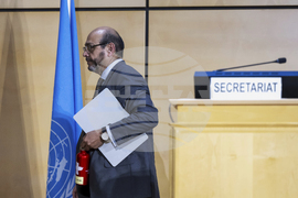Luis Vayas Valdivieso, chair of the negotiating committee, leaves, during a plenary session of second part of the fifth session of the Intergovernmental Negotiating Committee on Plastic Pollution at the European headquarters of the United Nations in Geneva, Switzerland, Thursday, Aug. 14, 2025. (Martial Trezzini/Keystone via AP)