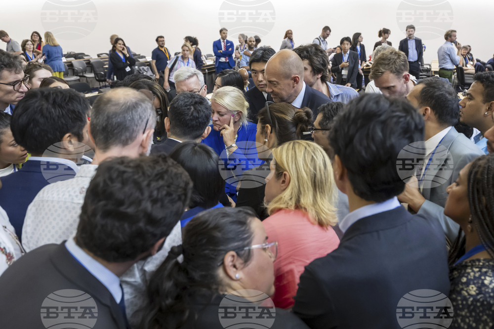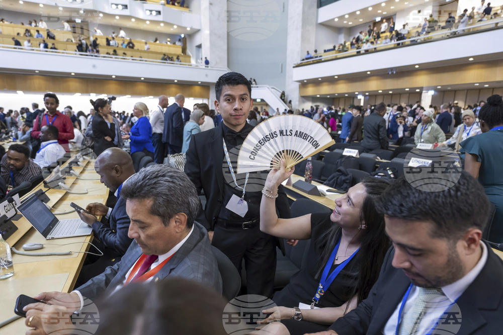 Delegates reacts during a plenary session of Second Part of the Fifth Session of the Intergovernmental Negotiating Committee on Plastic Pollution (INC-5.2), at the European headquarters of the United Nations in Geneva, Switzerland, Thursday, Aug. 14, 2025. (Martial Trezzini/Keystone via AP)