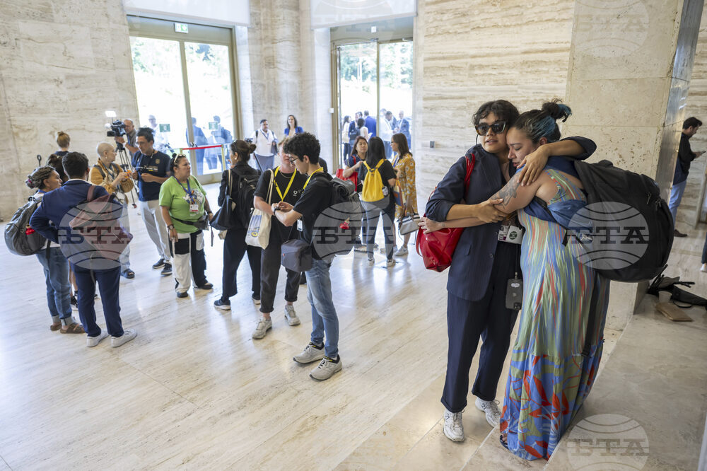 Members of the civil society embrace each other before leaving the second part of the fifth session of the Intergovernmental Negotiating Committee on Plastic Pollution, at the European headquarters of the United Nations in Geneva, Switzerland, Friday, Aug. 15, 2025. (Martial Trezzini/Keystone via AP)