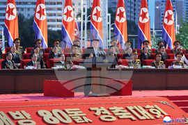 In this photo provided by the North Korean government, North Korean leader Kim Jong Un, center, delivers a speech during a celebration of the 80th anniversary of Korea's liberation from Japanese colonial rule, in Pyongyang, North Korea Thursday, Aug. 14, 2025. Independent journalists were not given access to cover the event depicted in this image distributed by the North Korean government. The content of this image is as provided and cannot be independently verified. Korean language watermark on image as provided by source reads: "KCNA" which is the abbreviation for Korean Central News Agency. (Korean Central News Agency/Korea News Service via AP)