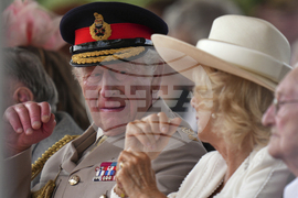 Britain's King Charles III and Queen Camilla react during a national service of remembrance at the National Memorial Arboretum in Alrewas, central England on August 15, 2025, to mark the 80th anniversary of VJ (Victory over Japan) Day. (Darren Staples/Pool Photo via AP)
