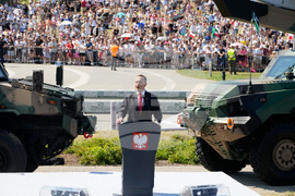 Newly sworn-in Polish President Karol Nawrocki, Commander-in-Chief of the Polish Armed Forces, leads the Armed Forces Day commemorations in Warsaw, Friday, Poland, Friday, Aug. 15, 2025. (AP Photo/Czarek Sokolowski)