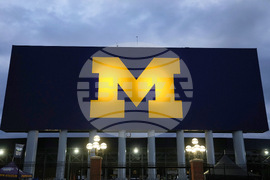 FILE - The block M logo for the University of Michigan is displayed at the school's NCAA college football stadium in Ann Arbor, Mich., Nov. 10, 2023. (AP Photo/Paul Sancya, File)