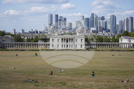 Dry and sun burnt gras spreads in Greenwich Park with the backdrop of Queens House and the high risers of Canary Wharf in London, Friday, Aug. 15, 2025. (AP Photo/Joanna Chan)
