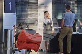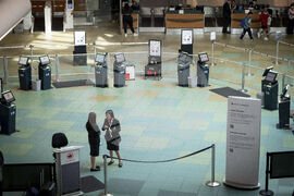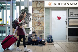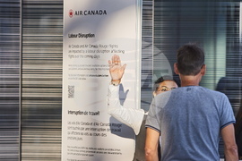 A man tries to check in to his Air Canada flight at the Vancouver International Airport in Richmond, B.C., Canada, on Saturday, Aug. 16, 2025. (Ethan Cairns/The Canadian Press via AP)