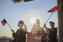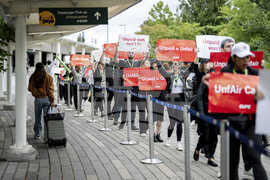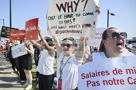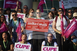 Air Canada flight attendants on strike picket at Pearson International Airport in Toronto on Saturday, Aug. 16, 2025. (Sammy Kogan/The Canadian Press via AP)
