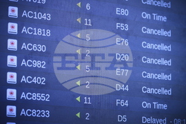 Air Canada flights show as cancelled at Pearson International Airport as flight attendants go on strike in Toronto on Saturday, Aug. 16, 2025. (Sammy Kogan/The Canadian Press via AP)