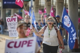 Air Canada flight attendants strike outside Halifax Stanfield International Airport in Halifax on Saturday, Aug.16, 2025. (Darren Calabrese/The Canadian Press via AP)