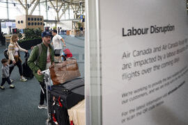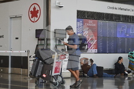 Travellers wait outside the Air Canada departure gates as flight attendants strike at Pearson International Airport in Toronto on Saturday, Aug. 16, 2025. (Sammy Kogan/The Canadian Press via AP)