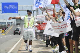 Air Canada flight attendants strike outside Montreal–Trudeau International Airport in Montreal, Saturday, Aug. 16, 2025. (Graham Hughes /The Canadian Press via AP)