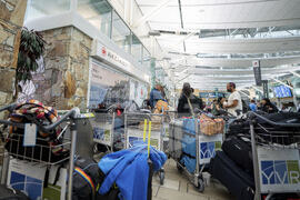 An empty Air Canada bag drop area is shown as Air Canada flight attendants strike at Montreal–Trudeau International Airport in Montreal, Saturday, Aug. 16, 2025. (Graham Hughes/The Canadian Press via AP)
