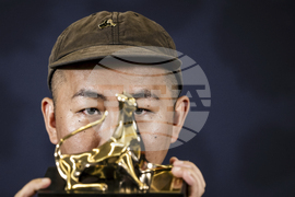 Golden Leopard winner Sho Miyake, film director from Japan, poses with the award "Pardo d'Oro - Grand Prize of the Festival and City of Locarno" of the "Concorso internazionale" category for the movie "Tabi to Hibi" (Two Seasons, Two Strangers) during a photocall at the 78th Locarno International Film Festival, in Locarno, Switzerland, Saturday, Aug. 16, 2025. (Jean-Christophe Bott/Keystone via AP)
