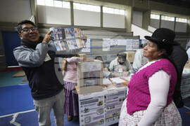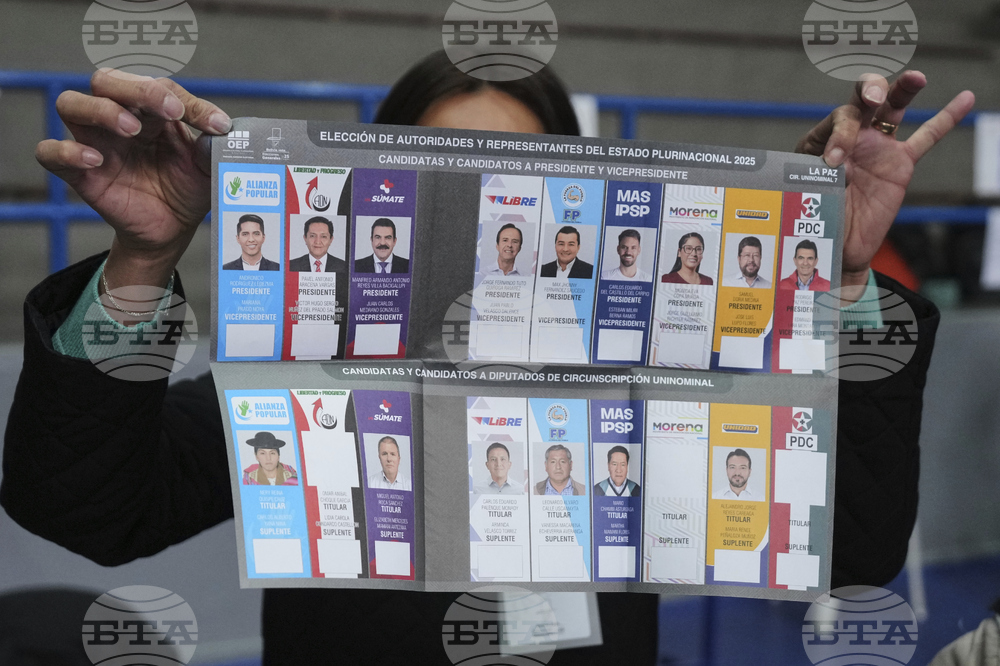 An electoral official displays a presidential ballot during general elections in La Paz, Bolivia, Sunday, Aug. 17, 2025. (AP Photo/Natacha Pisarenko)