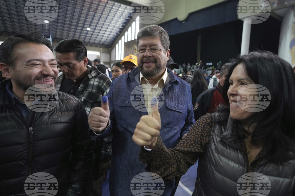 Presidential candidate Samuel Doria Medina, center, and his wife Nidia Monje, right, show their inked thumbs after voting in general elections in La Paz, Bolivia, Sunday, Aug. 17, 2025. (AP Photo/Natacha Pisarenko)