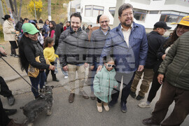 Presidential candidate Samuel Doria Medina posses for photos with children of supporters after voting in general elections in La Paz, Bolivia, Sunday, Aug. 17, 2025. (AP Photo/Natacha Pisarenko)