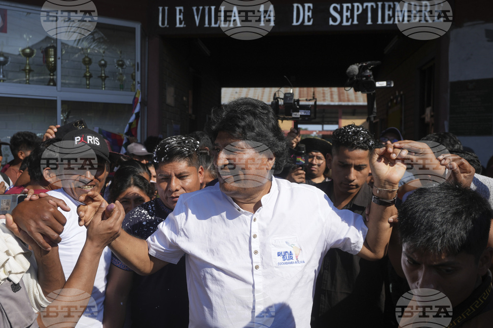 Former President Evo Morales greets supporters after voting in elections in Villa 14 de Septiembre, Chapare region, Bolivia, Sunday, Aug. 17, 2025. (AP Photo/Jorge Saenz)