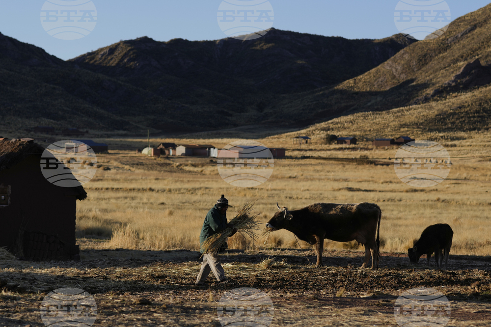 A man feeds cattle on election day in Jesus de Machaca, Bolivia, Sunday, Aug. 17, 2025.(AP Photo/Juan Karita)