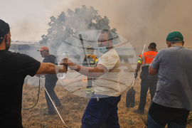 People battle a wildfire in Veiga das Meas, northwestern Spain, Saturday, Aug. 16, 2025. (AP Photo/Lalo R. Villar)