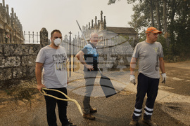 People stand in front a cemetery during a wildfire in Veiga das Meas, northwestern Spain, Saturday, Aug. 16, 2025. (AP Photo/Lalo R. Villar)