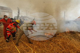 People react as they battle a wildfire in Veiga das Meas, northwestern Spain, Saturday, Aug. 16, 2025. (AP Photo/Lalo R. Villar)