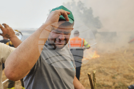 A man reacts as he battles a wildfire in Veiga das Meas, northwestern Spain, Saturday, Aug. 16, 2025. (AP Photo/Lalo R. Villar)
