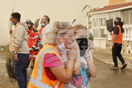 A woman is comforted during a wildfire in Veiga das Meas, northwestern Spain, Saturday, Aug. 16, 2025. (AP Photo/Lalo R. Villar)