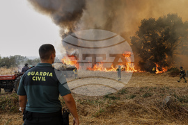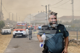 A Civil Guard reacts during a wildfire in Veiga das Meas, northwestern Spain, Saturday, Aug. 16, 2025. (AP Photo/Lalo R. Villar)