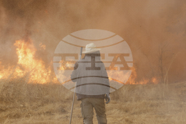 A firefighter walks through the smoke during a wildfire in Veiga das Meas, northwestern Spain, Saturday, Aug. 16, 2025. (AP Photo/Lalo R. Villar)