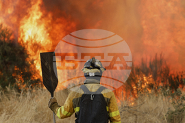 A firefighter stands as he battles a wildfire in Veiga das Meas, northwestern Spain, Saturday, Aug. 16, 2025. (AP Photo/Lalo R. Villar)
