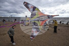 People launch a kite in the shape of a military jet during a kites festival in St. Petersburg, Russia, Saturday, Aug. 16, 2025. (AP Photo/Dmitri Lovetsky)