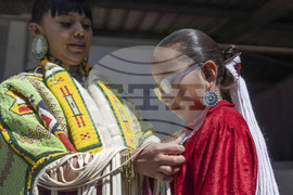 FILE - Shantal Sandoval, left, and her eight year-old daughter Chanel Yazzie, of To'hajiilee, N.M., prepare to participate in a horse parade at the 40th anniversary of the Gathering of Nations Pow Wow in Albuquerque, N.M., April 28, 2023. (AP Photo/Roberto E. Rosales, File)