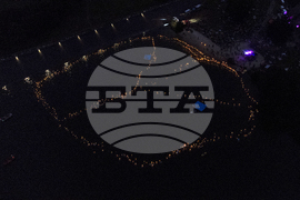 An aerial view of the final choreography of torchbearers in water in the form of a peace sign during a world record attempt early Sunday, Aug. 17, 2025, in Greifenstein, Germany. (Hannes P. Albert/dpa via AP)