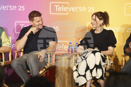 IMAGE DISTRIBUTED FOR THE TELEVISION ACADEMY - Stars David Boreanaz, from left, and Emily Deschanel reunite during "Bones: 20th Anniversary Retrospective with Creator and Cast," and explore the show's enduring resonance during Televerse 25, a festival by the Television Academy, on Saturday, Aug. 16, 2025 at the JW Marriott L.A. LIVE in Los Angeles. (Photo by Todd Williamson/Invision for the Television Academy/AP Content Services)