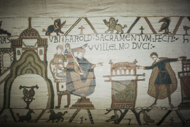 FILE - This photo taken Wednesday, Sept. 18, 2019, shows a detail of the 11th century Bayeux tapestry chronicling the Norman conquest of England, in Bayeux, Normandy, France. (AP Photo/Kamil Zihnioglu, File)