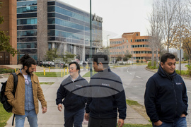 Actor Sebastián Solorza, who has Down syndrome and aims to run for president as an independent candidate, walks with coworkers in Santiago, Chile, Thursday, July 31, 2025. (AP Photo/Esteban Felix)