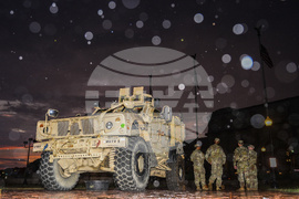 Members of the District of Columbia National Guard stand next to their M-ATV outside Union Station, Sunday, Aug. 17, 2025, in Washington. (AP Photo/Julia Demaree Nikhinson)