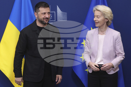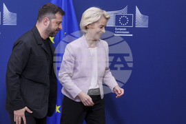 Ukraine's President Volodymyr Zelenskyy, left, walks with European Commission President Ursula von der Leyen after participating in a media conference at EU headquarters in Brussels, Belgium, Sunday, Aug. 17, 2025. (AP Photo)