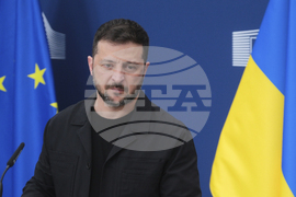 Ukraine's President Volodymyr Zelenskyy speaks during a media conference at EU headquarters in Brussels, Belgium, Sunday, Aug. 17, 2025. (AP Photo)