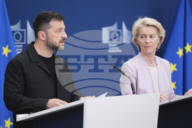 European Commission President Ursula von der Leyen, right, and Ukraine's President Volodymyr Zelenskyy participate in a media conference at EU headquarters in Brussels, Belgium, Sunday, Aug. 17, 2025. (AP Photo)