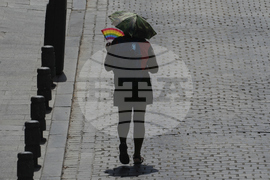 Two women walk with their heads covered to protect from the sun during extreme hot weather in Madrid, Spain, Sunday, Aug. 17, 2025. (AP Photo/Paul White)