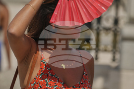 A woman fans herself during extreme hot weather in Madrid, Spain, Sunday, Aug. 17, 2025. (AP Photo/Paul White)