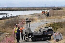 Crew members work on a wildlife exclusion fence at the Pond A2W site of the South Bay Salt Pond Restoration Project in Mountain View, Calif., Thursday, July 24, 2025. (AP Photo/Godofredo A. Vásquez)