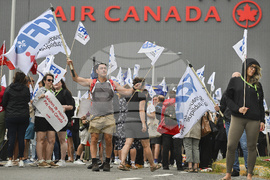 Air Canada employees and union members protest outside the Air Canada headquarters in Montreal, Sunday, Aug. 17, 2025, after the federal government intervened in the labour dispute between the airline and the union representing its flight attendants, ordering binding arbitration and operations to resume. (Graham Hughes/The Canadian Press via AP)