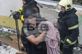 Firefighters evacuate a cat during search and rescue works in the damaged residential building following Russia's missile attack in Kharkiv, Ukraine, Monday, Aug. 18, 2025. (AP Photo/Andrii Marienko)