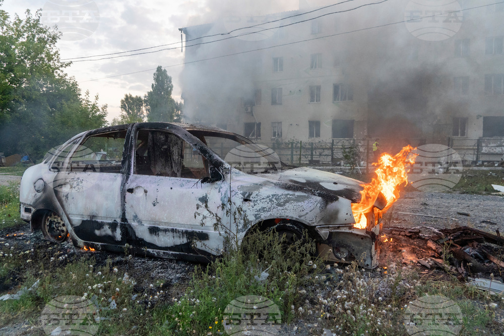 A car burns against the background of a damaged residential building following Russia's missile attack in Kharkiv, Ukraine, Monday, Aug. 18, 2025. (AP Photo/Andrii Marienko)