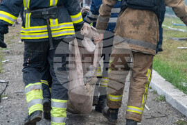 Rescue workers carry a dead body from a residential building damaged by a Russian attack on Kharkiv, Ukraine, Monday, Aug. 18, 2025. (AP Photo/Andrii Marienko)