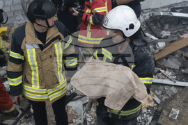 A rescuer carries a body of child from a residential building damaged by a Russia's missile attack on Kharkiv, Ukraine, Monday, Aug. 18, 2025. (AP Photo/Andrii Marienko)