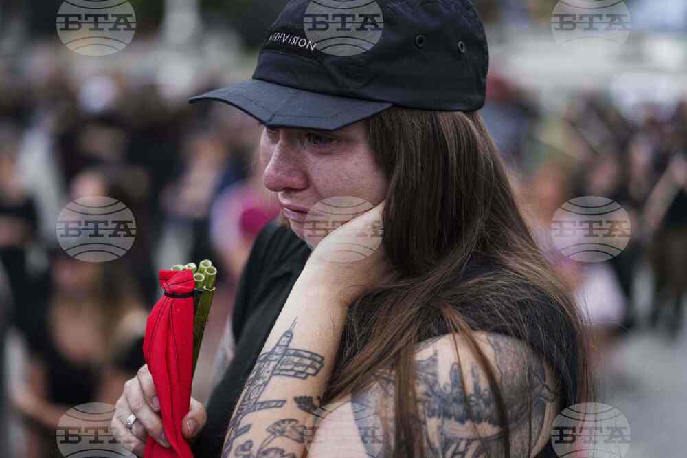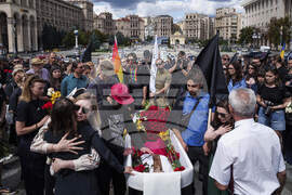 A woman mourns during the farewell ceremony of David Chichkan, a Ukrainian serviceman and artist at Independence square in Kyiv, Ukraine, on Monday, Aug. 18, 2025. (AP Photo/Evgeniy Maloletka)
