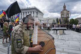 A Ukrainian soldier plays on Bandura during the farewell ceremony of David Chichkan, a Ukrainian serviceman and artist at Independence square in Kyiv, Ukraine, on Monday, Aug. 18, 2025. (AP Photo/Evgeniy Maloletka)