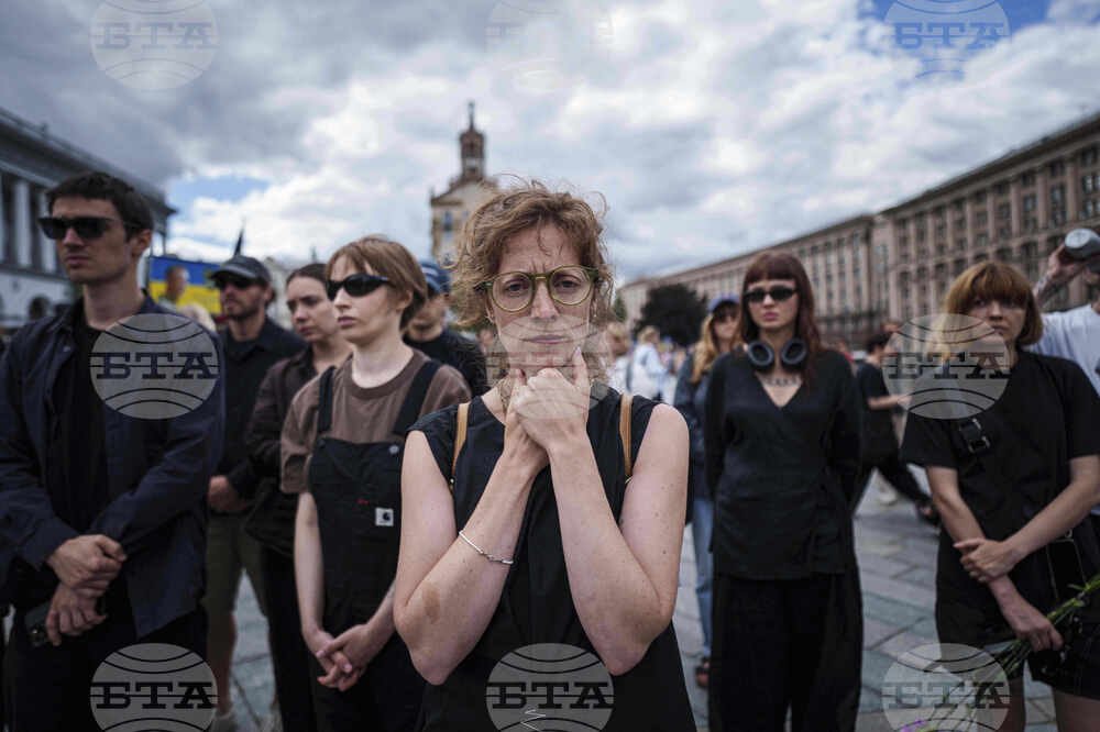 People stand on knees during the farewell ceremony of David Chichkan, a Ukrainian serviceman and artist at Independence square in Kyiv, Ukraine, on Monday, Aug. 18, 2025. (AP Photo/Evgeniy Maloletka)